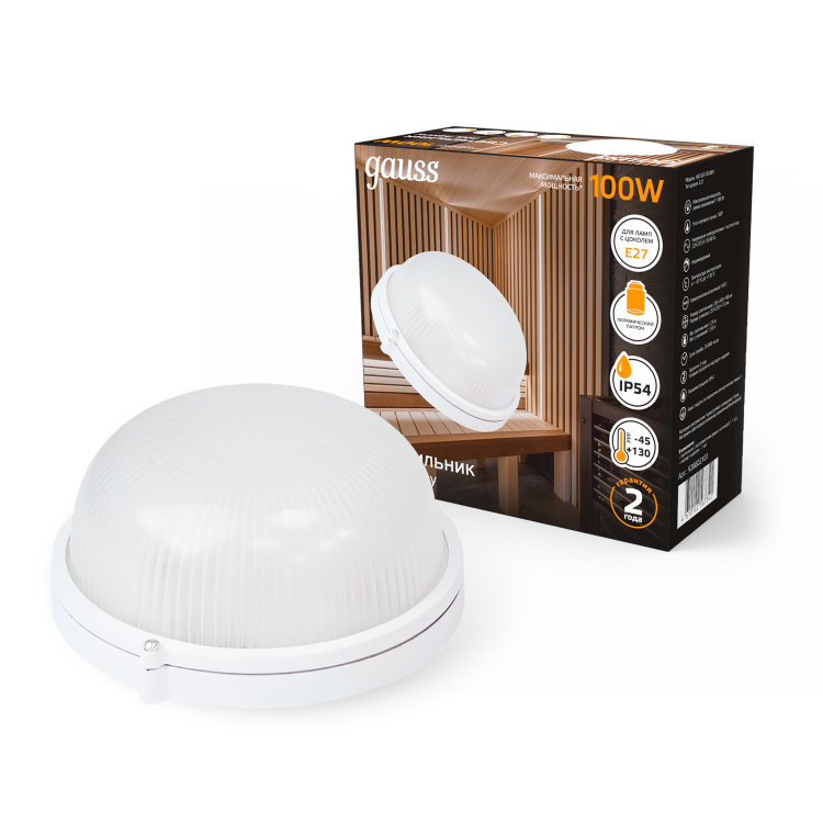 Светильник Gauss НБП круглой формы с цоколем Е27, рассчитан на max мощность 100W имеет алюминиевый корпус, который не нагревается, и предназначен для освещения бытовых, производственных и общественных помещений с повышенной влажностью. Он отлично подходит для использования в саунах, банях, складах, подсобных и производственных помещениях, сервисных центрах, входных группах, коридорах и межэтажных пространствах. Благодаря степени защиты IP54, светильник обладает повышенной стойкостью к пыли и влаге. Светильник Gauss НБП обеспечивает эффективное и долговечное освещение, комфорт и электробезопасность пространства, обладает высокой энергоэффективностью. Кроме того этот светильник будет служить долго и надежно, благодаря качественным материалам и современным технологиям изготовления. И в сауне, и в гараже, и в погребе он обеспечит вас ярким светом, бережно расходуя энергию. Приобретая светильник Gauss НБП, вы на годы избавляетесь от проблемы с освещением.