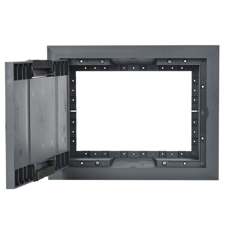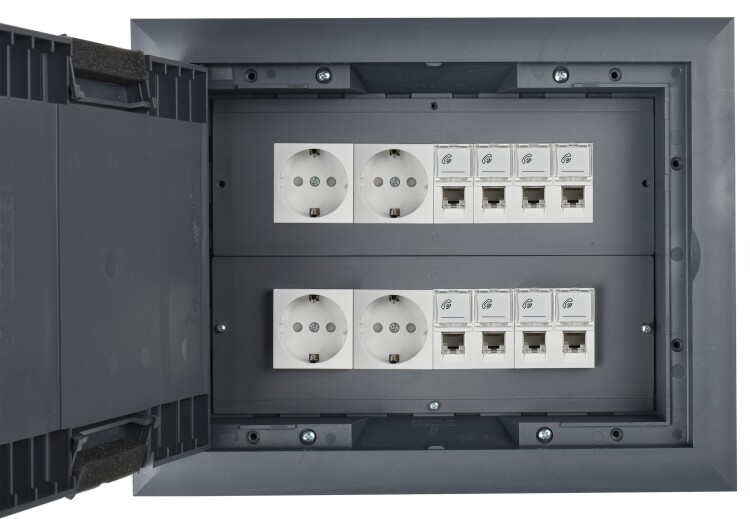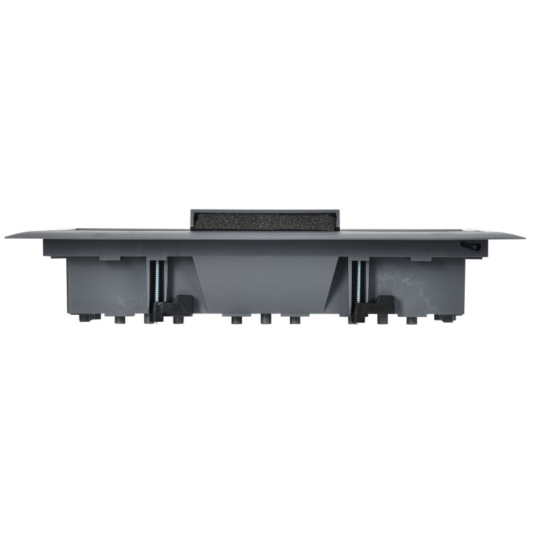 Лючок напольный ONFLOOR 24. Предназначен для организации рабочих мест в офисных или административных помещениях. В лючок можно установить до 24 модулей (12 постов 45х45 мм / 24 модуля 45х22,5). Возможна установка лючка в фальшпол толщиной от 10 до 40 мм, необходимое монтажное отверстие для установки лючка 218х288 мм, либо в бетонный пол с обязательным использованием коробки напольной: KNU-80-16-PA-9011 (рама лючка крепится на коробке напольной с помощью винтов, которые поставляются в комплекте). Крышка лючка имеет небольшое углубление, усиленное стальным листом, для монтажа напольного покрытия с максимальной толщиной 7 мм (рекомендуемые напольные покрытия - ковер или ламинат). Крышка содержит 2 откидных вывода с мягким материалом, которые позволяют организовать вывод кабелей из лючка. Степень защиты IP30 - коробка не предназначена для влажной уборки. Конструкция лючков рассчитана на максимальную нагрузку 1500Н. Комплект поставки: Лючок напольный ONFLOOR 24 - 1 шт., трафарет для финишного покрытия - 1 шт., комплект крепежа - 1 компл. Рамки для установки ЭУИ и коробки для установки лючка в бетонный пол приобретаются отдельно. Цвет: тeмно-серый RAL 7012.
