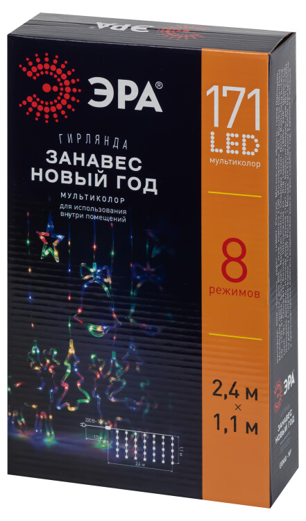 Новогодняя гирлянда светодиодная Эра занавес Новый Год. Такое украшение позволит Вам создать в доме теплую и душевную обстановку, наполненную уютом и светом. LED - лампочки, встроенные в светильники, обладают приятным свечением, которое не приносит дискомфорта для глаз. Особенно важно, насколько LED - лампы экономичны и долговечны - их срок службы составляет 30000 часов. Длина провода составляет 1,5 метра, что подойдет для небольшой елки, размещенной в доме или квартире. Гирлянду можно разместить не только на елке: например, она будет отлично смотреться на изголовье кровати или на стене. Купив новогоднее украшение ЭРА вы останетесь довольны и сможете создать праздничную атмосферу в доме!