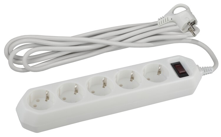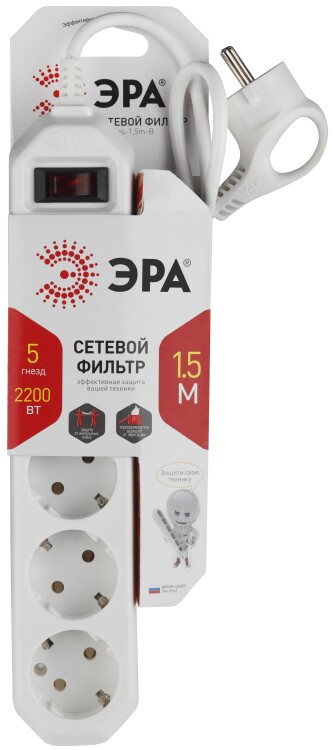 Фильтр сетевой пятиместный USF-5es-1.5m-W "Эра" Б0019031 (ПВС 3 х 0,75 кв.мм), с заземлением, с выключателем, белый, 1,5 м