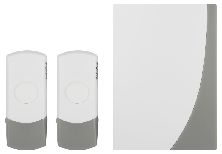 Беспроводной электрический дверной звонок с двумя кнопками, защищёнными от влаги и пыли. Отличное решение для дачи или загородного дома, когда на территорию есть разные входы. Для каждой кнопки своя полифоническая мелодия. Звонок работает от батареек: 1 шт А23 для кнопки (входит в комплект), 2 шт АА пальчиковые для динамика (в комплект не входят). Аккуратный бело-серый дизайн актуален для любого интерьера. Приятная упаковка делает данный звонок хорошим подарком на новоселье и другие праздники.