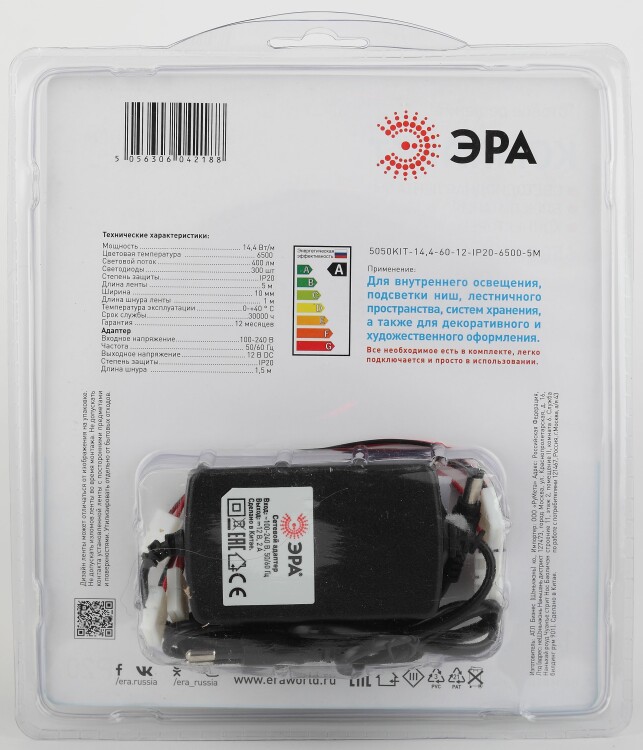 ЭРА Комплект светодиодной ленты 5050kit-14,4-60-12-IP20-6500-5m (50/300) со степенью защиты от пыли и влаги IP20 - современный способ создания внутреннего освещения, подсветки ниш, лестничного пространства, систем хранения, а также декоративного и художественного оформления любых объектов и форм в помещениях.