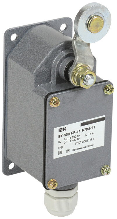 Концевой выключатель IEK ВК-300 предназначен для применения в электрических цепях управления, сигнализации и контроля относительного положения подвижных частей механизма в пространстве.