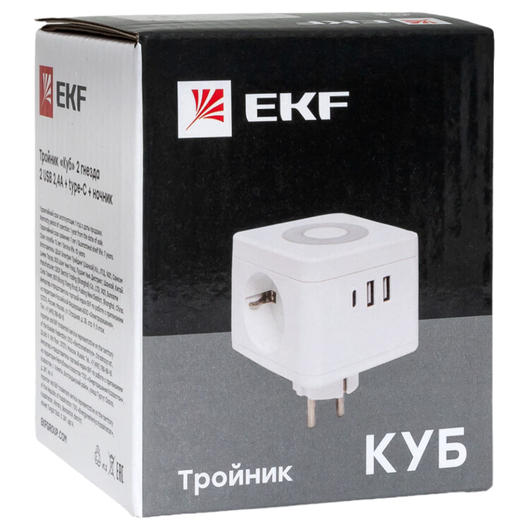 Бытовой удлинитель EKF UBA-CUB-2-TC серии "Куб" предназначен для подключения к электрической сети всех видов бытовой и офисной техники, для зарядки и питания устройств через порты USB, а также для подсветки помещений в качестве ночника.