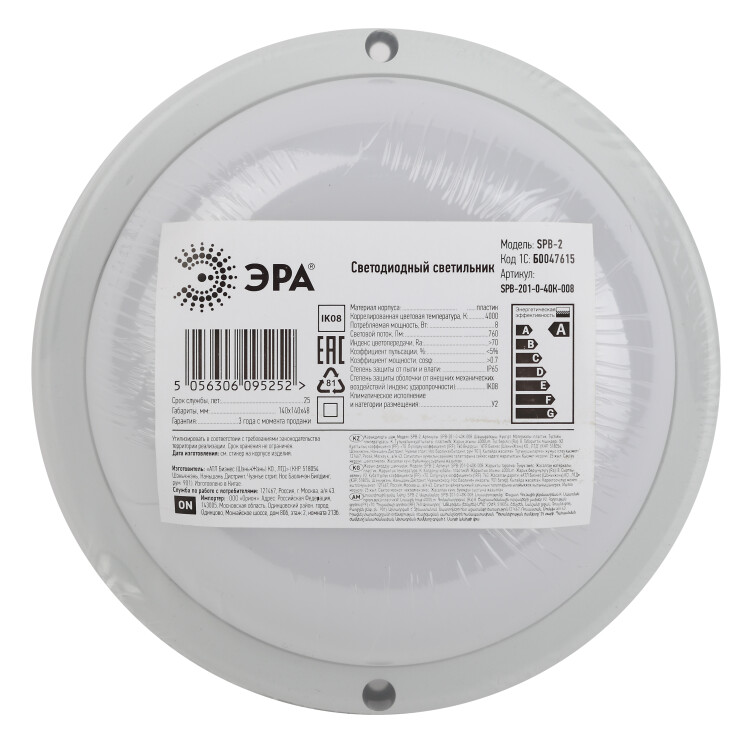 Светильник ДПП 8Вт 4000К 760лм круг белый IP65 SPB-201 ЭРА