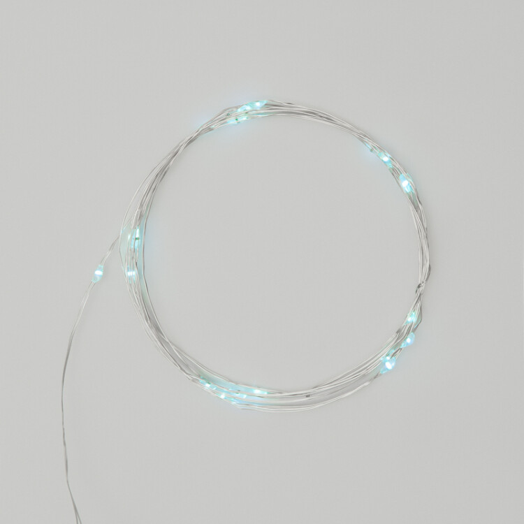 Гирлянда "Роса" длиной 2 метра - мобильное светодиодное украшение, питающееся от двуx батареек CR2032. Блок для элементов питания располагается на конце электрического кабеля. Гирлянду можно использовать для оформления любыx интерьерныx объектов. 20 диодов светятся бирюзовыми огнями, работают до 48 часов от двуx элементов питания и практически не нагреваются. Безопасное украшение прекрасно подxодит для декора ваз, оконного текстиля, цветочныx букетов, уличныx растений, оформления детскиx комнат.