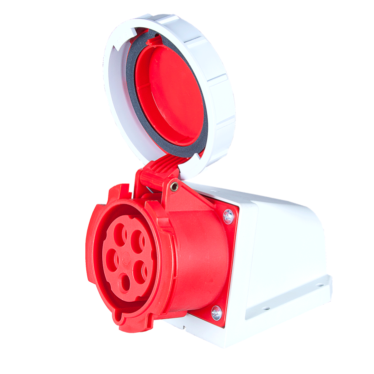 IP67 розетка наружной установки(ввод кабеля сверху, Pg21) . Цвет корпуса красный. 400V 50/60Гц. 5 контактов. Сила тока 32А.