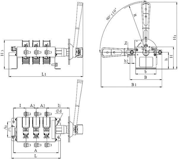| А | А1 | А2 | B | B1 | L1 | L | b | b1 | b2 | H | H1 | H3 | I | I1 | h | d | R |