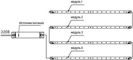 - Предварительно отключив питающую сеть, подключите светильник к сети 220 В через клеммные колодки на источнике питания, в соответствии с маркировкой.