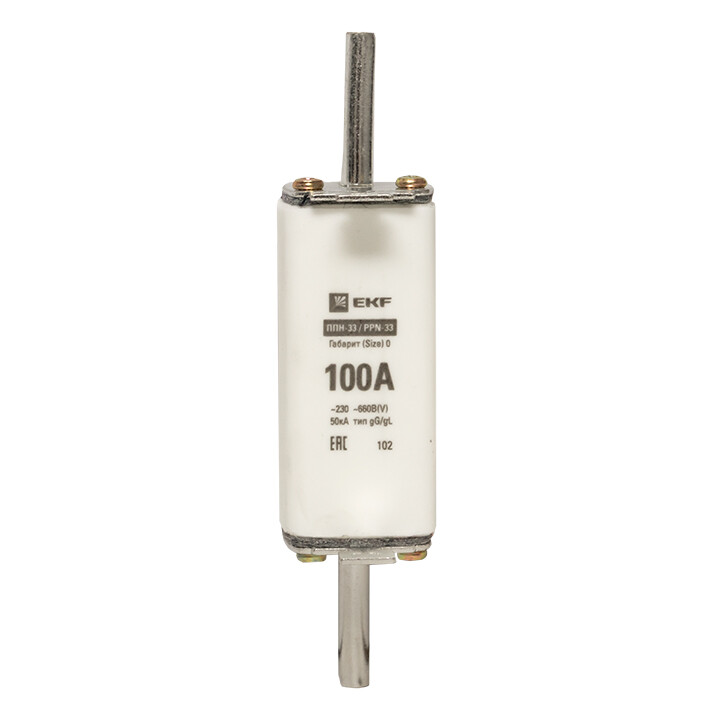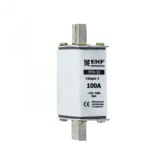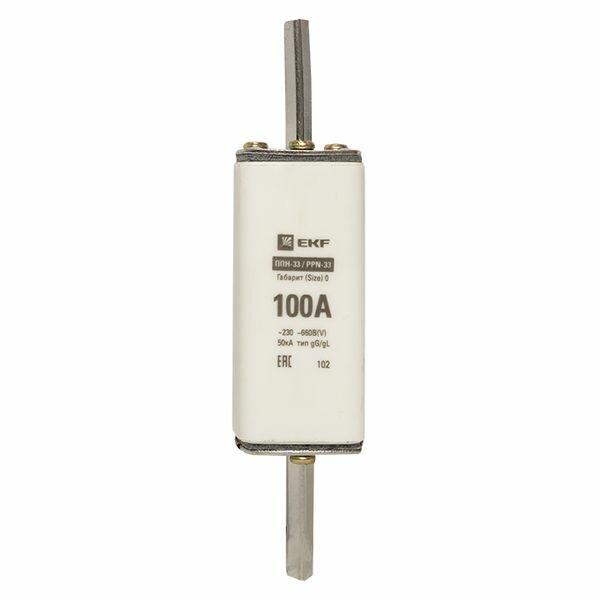 Плавкая вставка ППН-33 160/100А габарит 0 EKF. Предохранители плавкие ППН EKF, укомплектованные плавкими вставками типа gG/gL, предназначаются для защиты кабельных линий и промышленных электроустановок от токов перегрузки и короткого замыкания. Предохранители применяются в электрических сетях переменного тока частотой 50 Гц с напряжением до 660В. Применяются для крепления в распределительных и вводно-распределительных устройствах. Предохранители плавкие ППН могут устанавливаться в основание с держателем, а также в специально предназначенные рубильники. В комплект поставки предохранителей плавких ППН основание с держателем не входит и приобретается отдельно.