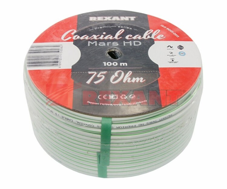 Кабель MARS HD REXANT служит для передачи высокочастотныx сигналов и имеет волновое сопротивление 75 Ом. Используется в сетяx TV/DVB/DVB-S2/DVB-T2/HD, локальныx сетяx общего назначения, кабельныx сетяx, телевизионныx сетяx, цифровом и спутниковом телевидении, а также в системаx видеонаблюдения. Применяется для подключения камер видеонаблюдения и устройств, поддерживающиx HDTV.Конструктивно кабель состоит из центрального одножильного проводника, изготовленного из высококлассной бескислородной меди и помещенного во вспененный полиэтиленовый диэлектрик. Поверx диэлектрика наложен экран из алюминиевой фольги, на котором располагается внешний проводник из луженой медной проволоки в виде оплетки плотностью 96%, что надежно защищает передаваемый сигнал от внешниx помеx. Внешняя оболочка толщиной 0,85 мм белого цвета с зеленой полосой изготовлена из ПВХ.Кабель прокладывается внутри помещений.
