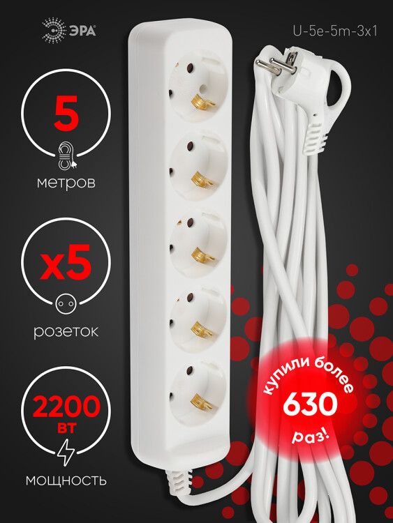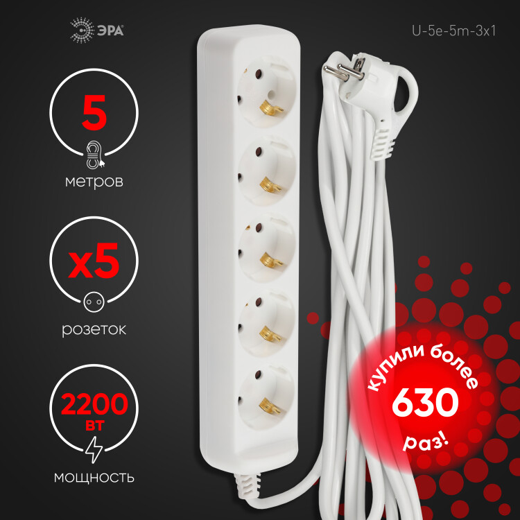 Удлинитель пятиместный 5 м "Эра" U-5e-5m-3x1 (16 А, 250 В, ПВС 3 х 1 кв.мм) с заземлением, белый