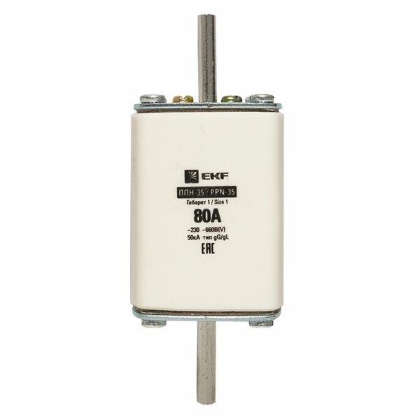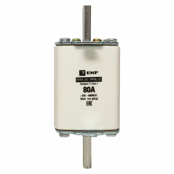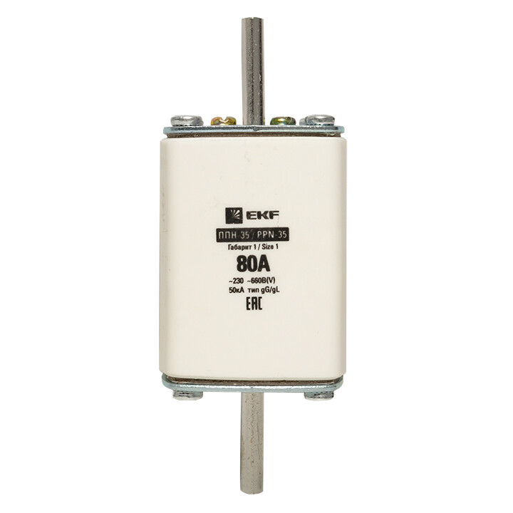 Плавкая вставка ППН-35 250/ 80А габарит 1 EKF. Предохранители плавкие ППН EKF, укомплектованные плавкими вставками типа gG/gL, предназначаются для защиты кабельных линий и промышленных электроустановок от токов перегрузки и короткого замыкания. Предохранители применяются в электрических сетях переменного тока частотой 50 Гц с напряжением до 660В. Применяются для крепления в распределительных и вводно-распределительных устройствах. Предохранители плавкие ППН могут устанавливаться в основание с держателем, а также в специально предназначенные рубильники. В комплект поставки предохранителей плавких ППН основание с держателем не входит и приобретается отдельно.
