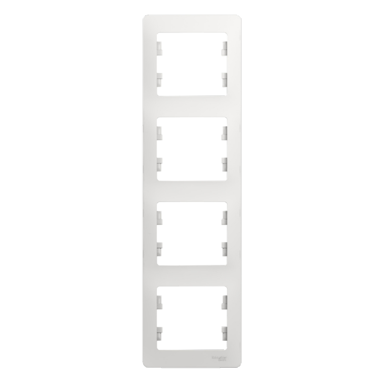 Рамка Systeme Electric (ранее Schneider Electric) серии Glossa (цвет белый) четырёхместная. Устанавливается в вертикальном положении. Выполнена из материала PС+ASA, стойкого к УФ-излучению и появлению царапин. Позволяет гармонично вписать электроустановочное изделие в интерьер помещения.