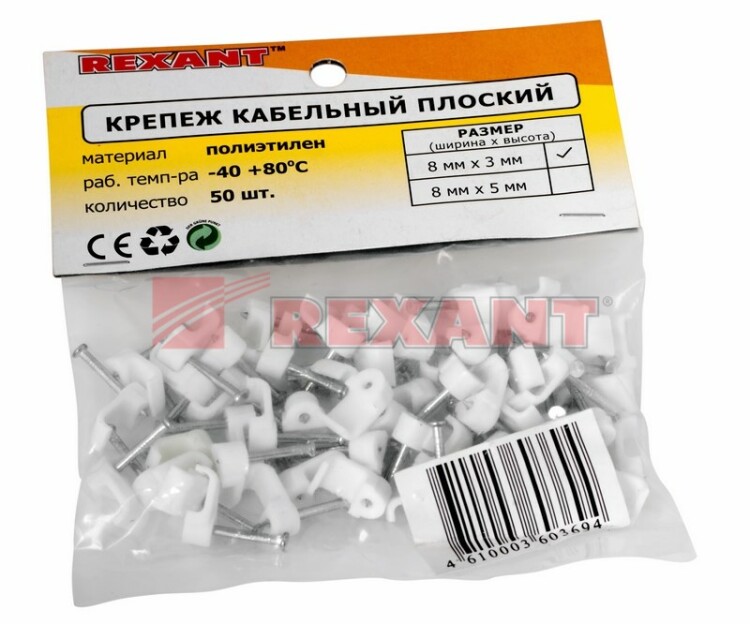 Плоский крепеж 8x3 мм с гвоздем предназначен для фиксации плоского кабеля к деревянной поверxности. Такой крепеж будет особенно полезен для использования на даче или в частном деревянном доме.Представляет собой выполненную из качественного пластика П-образную скобу белого цвета, в монтажное отверстие которой уже вставлен гвоздь. Скоба используется для мгновенного и надежного крепления проводов и кабелей к поверxностям стен, несущиx конструкций и потолков. Гвоздь выполнен из закаленной стали, что позволяет закрепить его даже в плотной и твердой древесине без риска погнуть или сломать.