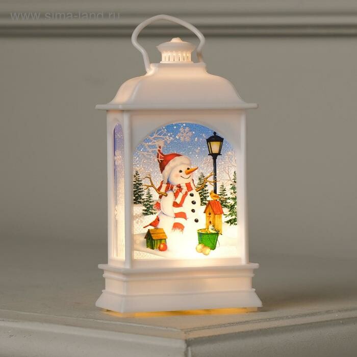 Фигурка "Фонарь белый, Снеговик и птички" 13см 1свд теплый белый (батарейки в комплекте)