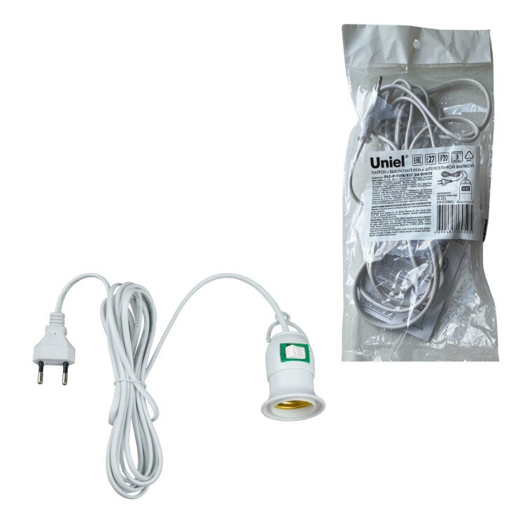 DLC-P-T50B/E27 3M WHITE Патрон подвесной с выключателем и штепсельной вилкой, 300 см. Цоколь Е27. Белый. TM Uniel
