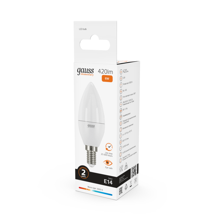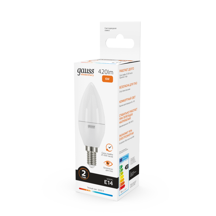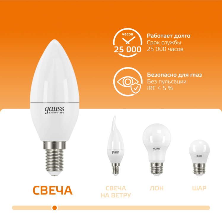 Светодиодные лампы Gauss Elementary Candle созданы в форме свечи. Лампы подойдут как для домашнего, так и для коммерческого использования. Такой тип освещения прекрасно смотрится в светильниках без плафонов или устанавливается в люстры и бра. Модель обладает широким диапазоном цветовых температур и мощностей, что поможет создать атмосферу тепла и уюта или концентрации. Равномерный спектр света создает зрительный комфорт в любом помещении. Данный тип освещения от Gauss обеспечивают стабильную работу в течение всего срока службы.