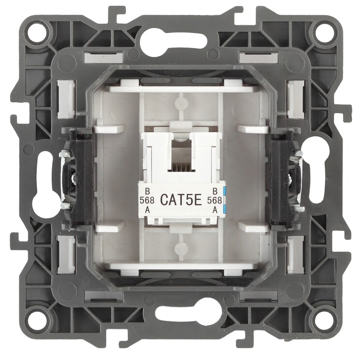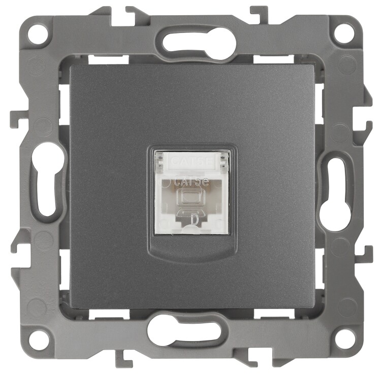 Розетка интернет RJ45 серии Эра 12 скрытой установки механизм цвет графит 12-3107-12. Сделана из поликарбоната. Монтаж в подрозетник производится и на лапки, и на винты. Рамки приобретаются отдельно. Рамки Эра 12: 1 пост 12-5001-хх, 2 поста 12-5002-хх, 3 поста 12-5003-хх, 4 поста 12-5004-хх, 5 постов 12-5005-хх. Рамки Эра 12 Сатин: 1 пост 12-5101-хх, 2 поста 12-5102-хх, 3 поста 12-5103-хх, 4 поста 12-5104-хх, 5 постов - 12-5105-хх (хх - код цвета: 01-белый, 02-слоновая кость, 03-алюминий, 04-шампань, 05-антрацит, 06-чёрный, 07-ольха(белёный дуб-сатин), 08-вишня, 09-дуб, 10-венге, 11-сосна, 21-жёлтый, 22-оранжевый, 23-красный, 24-охра, 25-бордо, 26-лайм, 27-зелёный, 28-голубой, 29-синий).