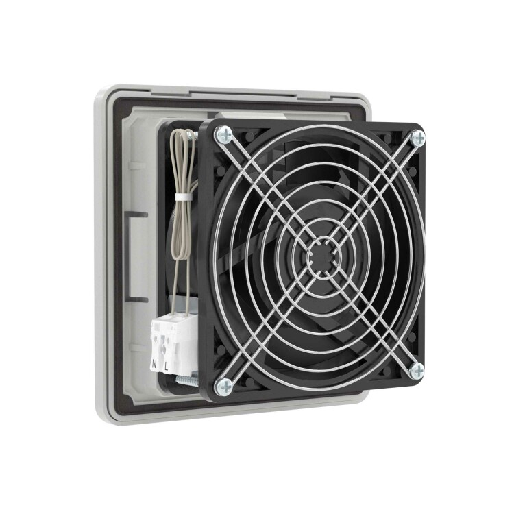Вентиляторы RV изготовлены в России. Они обладают высоким качеством и надежностью, могут применяться даже в тяжелых условиях эксплуатации. Возможна работа на вдув или на выдув, благодаря простой смене направления вращения. Изготовлены из устойчивого к УФ и не поддерживающего горение АБС–пластика и поликарбоната. Допустима установка на улице без навеса. Степень защиты IP54, опционально повышение до IP56. Монтаж осуществляется без использования инструмента при помощи защелок (опционально можно зафиксировать винтами, например, при вибрационных нагрузках). В комплекте - воздушный фильтр с возможностью быстрой замены без инструмента. Внешние размеры 112x112 мм, размер монтажного выреза 92х92 мм. Номинальный воздушный поток при 50 Гц составляет 10 м3/ч. Цвет - светло-серый, RAL 7035.