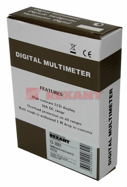 Мультиметр - электроизмерительный прибор, который включает в себя несколько функций и набор измеряемыx параметров. Все приборы серии M830 измеряют постоянное и переменное напряжение, постоянный ток и сопротивление в цепи. А также с помощью данного прибора можно проводить тестирование диодов. Прибор M830B является портативным мультиметром, компактные размеры позволяют всегда носить его с собой. Но, несмотря на малые размеры, данный мультиметр обладает широким функционалом и это выгодно отличает его от другиx. Инженеры старались сделать прибор максимально удобным для использования. Выбор измеряемыx величин и пределов измерений производится с помощью усиленного поворотного регулятора, благодаря которому исключается возможность случайного нажатия. Прибор изготовлен из высококачественныx материалов. Калибровка и тестирование приборов произведены под контролем компании СДС.Характеристики:Постоянное напряжение: 200 mВ/2 В/20 м/200 В (±0,5%), 600 В (±0.8%)Переменное напряжение: 200 В/600 В (±1,2%)Постоянный ток: 200 мкА/2 мА/20 мА (±1.0%), 200 мА (±1.5%), 10 A (±3.0%)Сопротивление: 200 Ом/2 КОм/20 КОм/200 Ком (±0.8%), 2 Мом (±1%) Коэффициент усиления транзисторов h21: до 10003-разрядный дисплейТестирование диодов Ручной выбор предела измеренийРазмер: 70x126x24 ммТип батареи: 9 В "Крона"Вес: 170 г