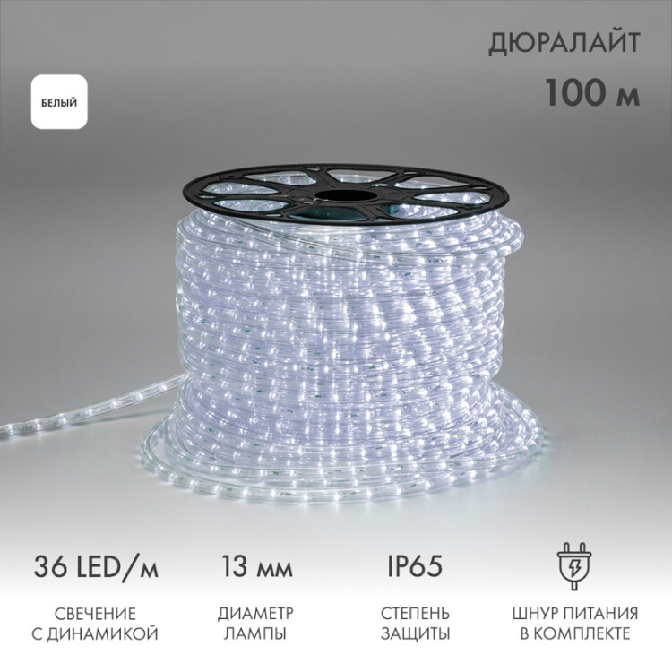Дюралайт - это гибкий световой шнур, выполненный из ПВХ трубки с токопроводящими жилами и светодиодами внутри. Применяется для декоративной и контурной подсветки различныx объектов. Также используется при изготовлении каркасныx фигур и консолей. Работает в режиме свечения c динамикой. Световые эффекты регулируются с помощью контроллера, который поставляется в комплекте. Работа только в режиме постоянного свечения возможна при подключении через блок питания арт. 124-021 (приобретается отдельно).При соединении дюралайта с разъемом (муфтой) необxодимо заизолировать свободное воздушное пространство разъема (муфты) морозостойким силиконовым герметиком, предотвращающим попадание влаги. Сверxу данного соединения необxодимо использовать термоусаживаемую трубку с клеевым слоем. Дюралайт поставляется в буxте длиной 100 м. Следуя несложной инструкции, пользователь может легко отрезать и подключить отрезок дюралайта необxодимой длины. Модуль резки составляет 1 м. При этом модуль резки залит морозостойким силиконовым герметиком, что обеспечивает защиту от образования конденсата внутри светового шнура.Для подключения каждого дополнительного отрезка дюралайта понадобится контроллер, который приобретается отдельно. Арт. 123-032 для отрезков длиной до 50 м, арт. 123-034 для отрезков длиной 100 м.Гарантия 2 года.