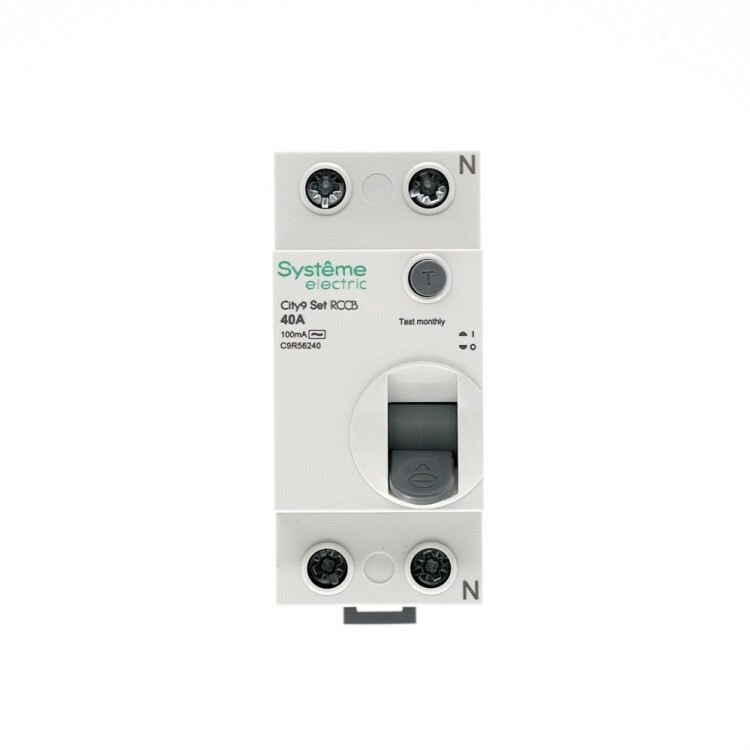 Выключатель дифференциального тока (ВДТ) или устройство защитного отключения (УЗО) серии City9 Set Systeme Electric, 2-полюсный, номинальный ток 40А, ток утечки 100 мА, тип АС, электромеханический. Применяется в электрических сетях напряжением 230В. Уставка по току утечки 100 мА обеспечивает гарантированную защиту людей при прямом и косвенном прикосновении. Кнопка тест обеспечивает проверку работоспособности аппарата. Крепление на DIN-рейку шириной 35 мм. Подключение сверху и снизу. Безопасные клеммы (ранее Schneider Electric Easy9 EZ9R54240).
