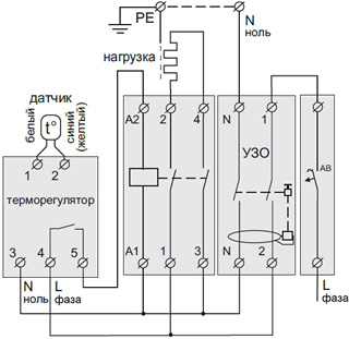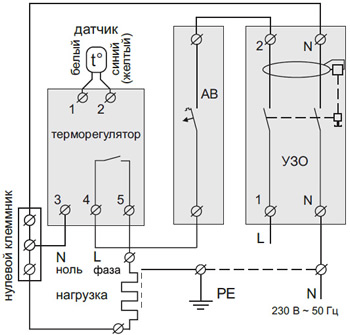 Для защиты от короткого замыкания и превышения мощности в цепи нагрузки обязательно необходимо перед терморегулятором установить автоматический выключатель (АВ), который устанавливается в разрыв фазного провода.