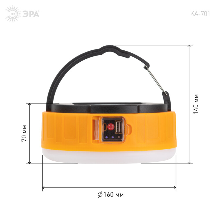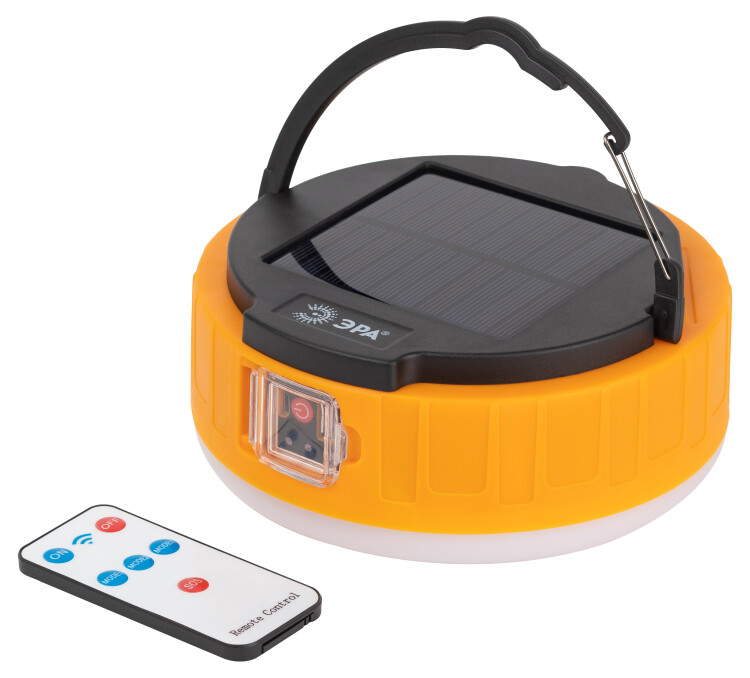 ЭРА КА-701 «Персей» – современный фонарь для кемпинга со встроенной солнечной батареей и пультом дистанционного управления. Аккумуляторный фонарь ЭРА «Персей» также заряжается от USB (кабель в комплекте). От одной зарядки непрерывно проработает 12 часов. Может использоваться в качестве powerbank – в условиях похода выручит, если нужно подзарядить телефон или другой мобильный гаджет. Мигающий 3-сегментный индикатор покажет уровень заряда аккумулятора. Разъёмы для зарядки фонаря и телефона, а также кнопка включения и управления режимами освещения, спрятаны в специальном отсеке под прозрачной пластиковой крышкой.