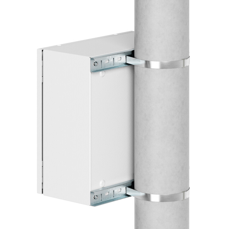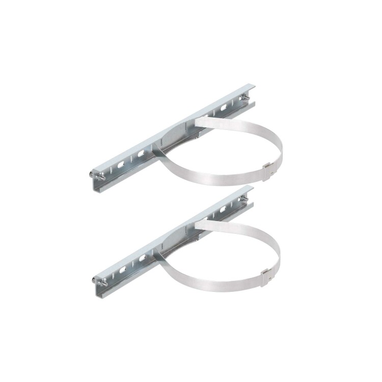 Комплект для крепления корпусов ST, STX, STE, STEX, STH, RAM box шириной 500 мм на опору. Крепежные профили изготавливаются из оцинкованной стали толщиной 2 мм, стяжные хомуты – из нержавеющей стали AISI 304. Максимальная статическая нагрузка на 2 профиля – 300 кг, подходят для круглых опор диаметром 40...195 мм или квадратных опор со стороной 60...165 мм. В комплект поставки входят: 2 профиля, 2 стяжных хомута, 2 замка для фиксации хомутов.