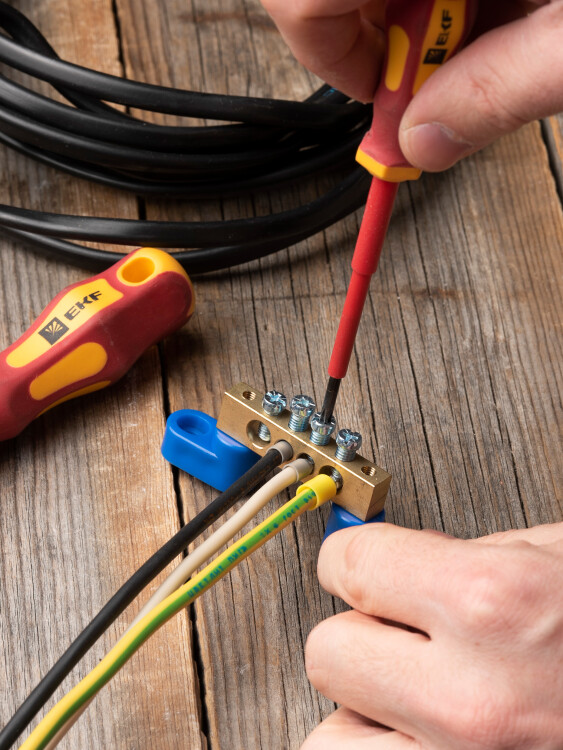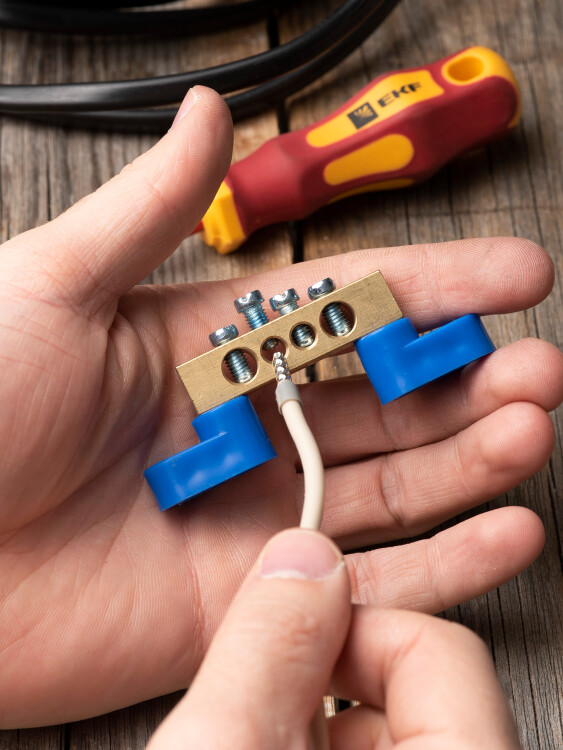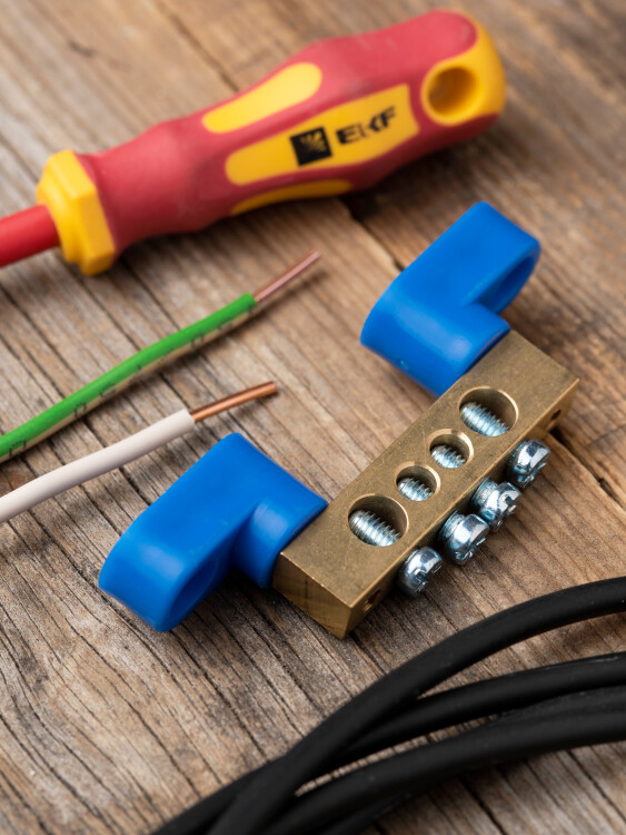 Шина нулевая 8*12 4групп 2 угловых изолятора синий винтовой по краям EKF