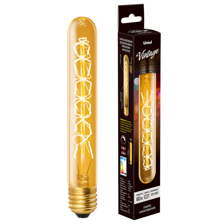 IL-V-L28A-60/GOLDEN/E27 CW01 Лампа накаливания Vintage. Форма «цилиндр», длина 185 мм. Форма нити CW. Картон. ТМ Uniel