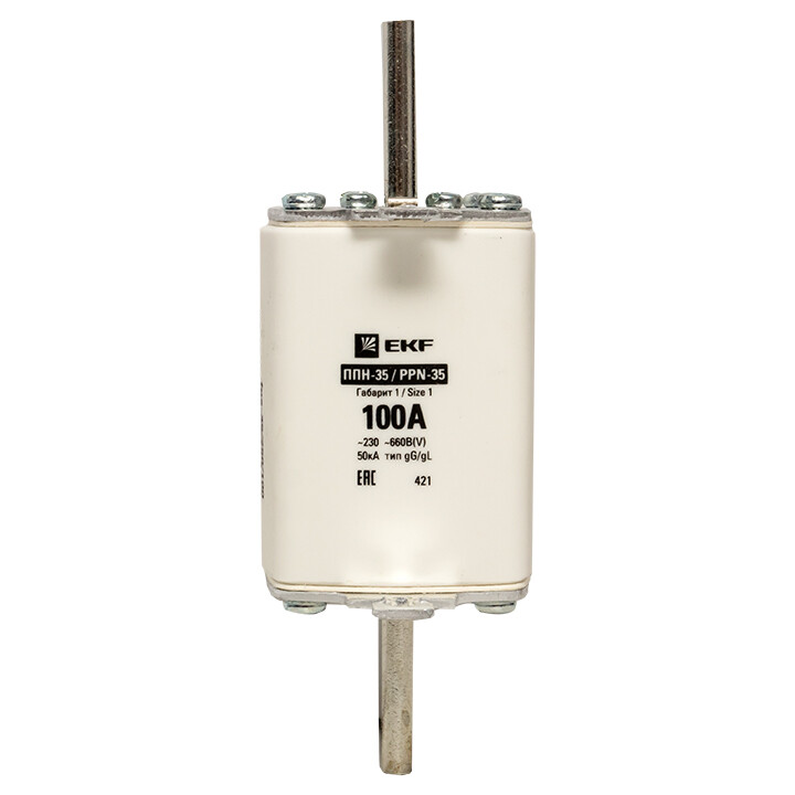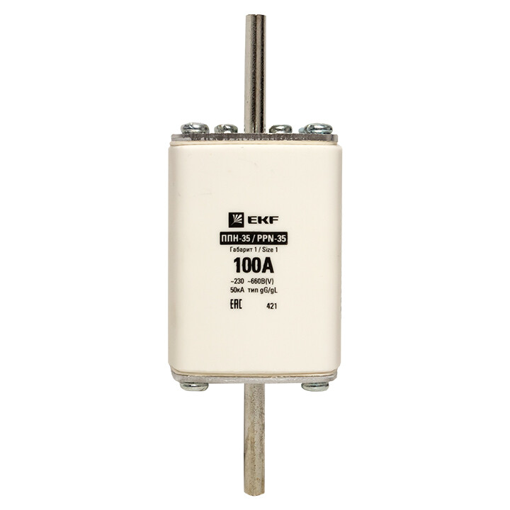 Плавкая вставка ППН-35 250/100А габарит 1 EKF. Предохранители плавкие ППН EKF, укомплектованные плавкими вставками типа gG/gL, предназначаются для защиты кабельных линий и промышленных электроустановок от токов перегрузки и короткого замыкания. Предохранители применяются в электрических сетях переменного тока частотой 50 Гц с напряжением до 660В. Применяются для крепления в распределительных и вводно-распределительных устройствах. Предохранители плавкие ППН могут устанавливаться в основание с держателем, а также в специально предназначенные рубильники. В комплект поставки предохранителей плавких ППН основание с держателем не входит и приобретается отдельно.