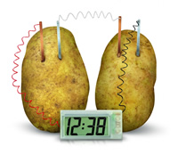 Картофель и металлические пластины из цинка и меди образуют батарею. Медь и цинк как электроды имеют разные свойства, что вызывает движение ионов между ними. Картофель как электролит способствует свободному перемещению ионов между пластинами. Вы можете заменить картофель различными жидкостями (соленой водой, соками) или фруктами (лимоном, апельсином, томатом). |