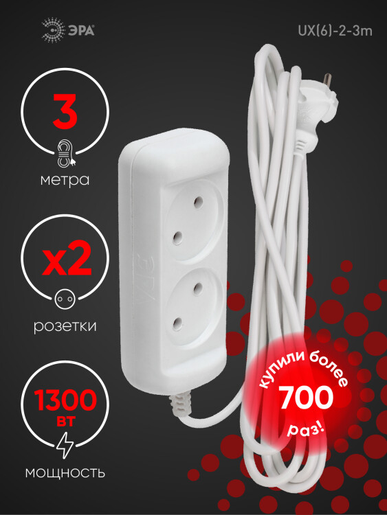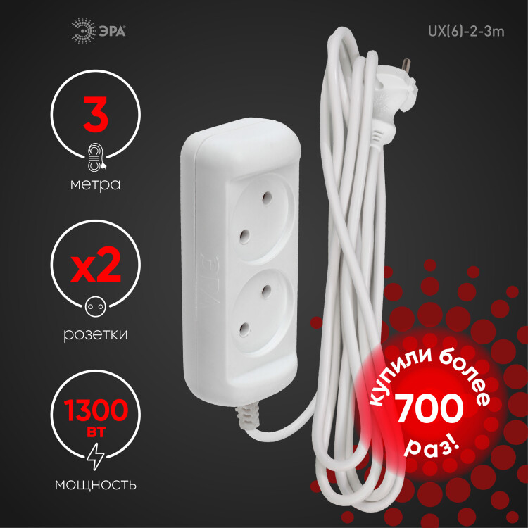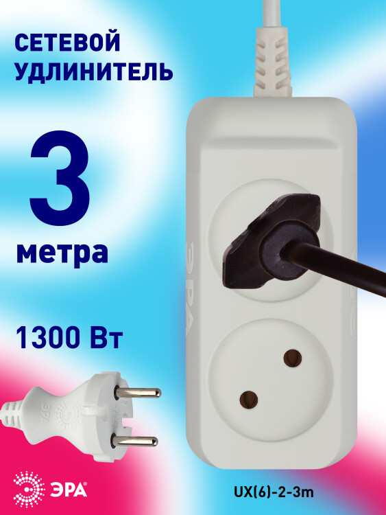 Удлинитель электрический Эра UX(6)-2-3m с заземл ением, ПВС, 2x0,75мм2, 2 розетки, 3 м. Рассчитан на максимальную мощность 6А/1300 Вт. Удлинитель Эра станет Вашим надежным помощником, если Ваши любимые электроприборы находятся далеко от розеток. Модель удлинителя на 6А позволяет подключить бытовые приборы общей нагрузкой до 1300Вт. Дизайн удлинителя разработан в России командой Эра Style.
