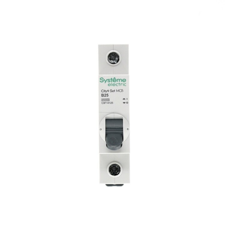 Автоматический выключатель серии City9 Set Systeme Electric, 1-полюсный, номинальный ток 25 А, характеристика B, Icn = 4.5 кА. Применяется в электрических сетях напряжением 230 В. Предназначен для защиты от перегрузок и токов короткого замыкания. Оснащен механизмом «мгновенной коммутации». Ударопрочный корпус из специального пластика с 6 металлическими заклепками. Безопасные клеммы исключают попадание кабелей в заклеммное пространство (ранее Schneider Electric Easy9 EZ9F14125).