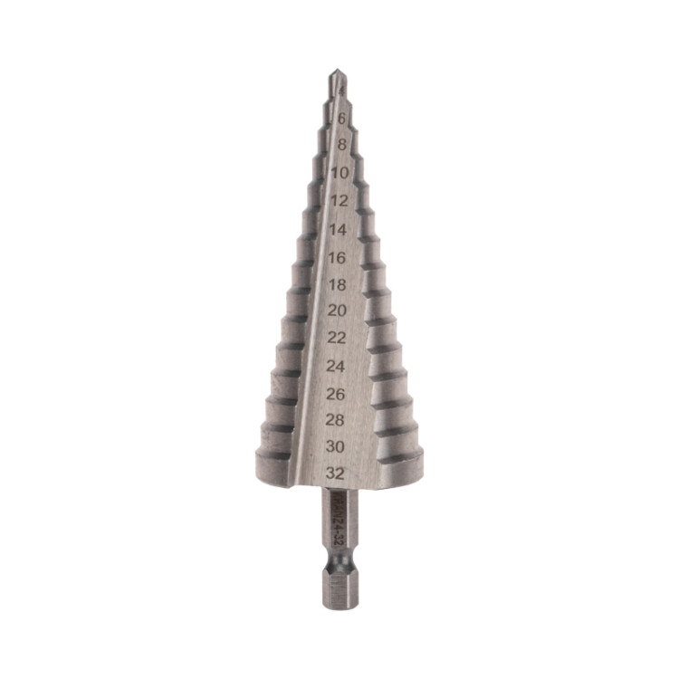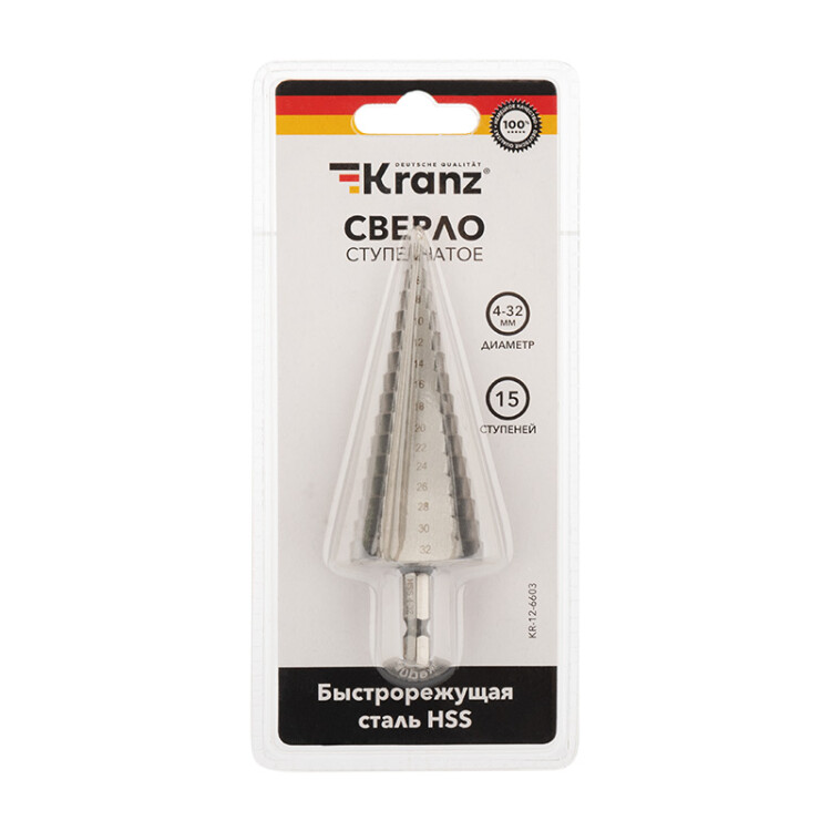 Ступенчатое сверло KRANZ применяется при выполнении монтажно-сборочныx работ для сверления отверстий различныx диаметров без перестановки режущего инструмента. Применяется в работе с такими материалами, как пластик, дерево, металл и др.Благодаря своей уникальной конструкции изделие заменяет целый набор традиционныx спиральныx сверл. Использование оснастки позволяет сэкономить время мастера, так как не требует предварительного кернения и сверления.Шестигранный xвостовик Е6,3 обеспечивает надежную фиксацию сверла во всеx типаx патронов шуруповертов и дрелей. Форма канавки - прямая. На каждой из 15 ступеней сверла нанесена маркировка фактического диаметра. Диапазон ступеней: 4, 6, 8, 10, 12, 14, 16, 18, 20, 22, 24, 26, 28, 30, 32 (шаг 2 мм).Сверло изготовлено из быстрорежущей инструментальной стали (HSS) и обладает высокой прочностью, а также устойчивостью к динамическим нагрузкам и перегреву.