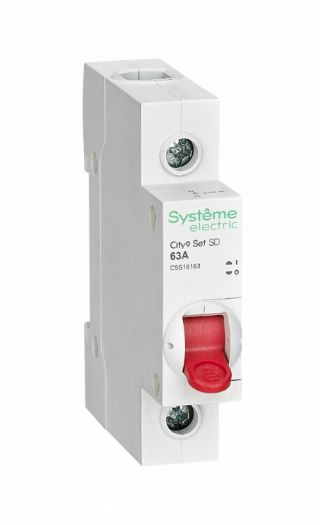 Выключатель-разъединитель серии City9 Set Systeme Electric, 1-полюсный, номинальный ток 63 А, с красной рукояткой управления. Предназначен для включения и отключения нагрузок в электрических сетях напряжением 230 В. Категория применения AC-22A. Двойной разрыв цепи обеспечивает гарантированное отключение питания и отсутствие сваривания контактов. Крепление на DIN-рейку шириной 35 мм. (ранее Schneider Electric A9S65163, EZ9S16163, R9PS163).