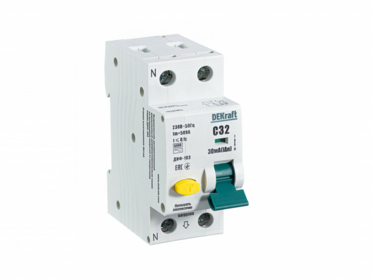Автоматический выключатель дифференциального тока серии ДИФ-103 Dekraft; 1P+N; ном.ток 32 А; характеристика C; откл.способность Icn = 6 kA; ток утечки 30 мА; тип - АС; блок дифф.защиты – электронный; ширина – 2 мод. х 18 мм; монтаж – на DIN-рейку. АВДТ применяются в сетях напряжением до 220 В пер.тока для защиты человека от поражения электрическим током и электроустановок от сверхтоков и токов утечки. Аппараты ДИФ-103 являются более компактным вариантом АВДТ по сравнению с серией ДИФ-101.