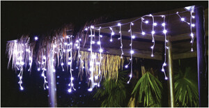 Светодиодная гирлянда бахрома SnowHouse OIC100LSE-B-T-I4 состоит из основного прозрачного провода, закрепляемого горизонтально, с которого свисают отрезки провода разной длины со светодиодами.