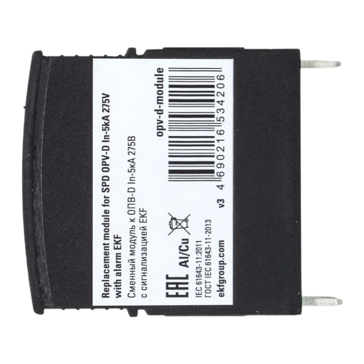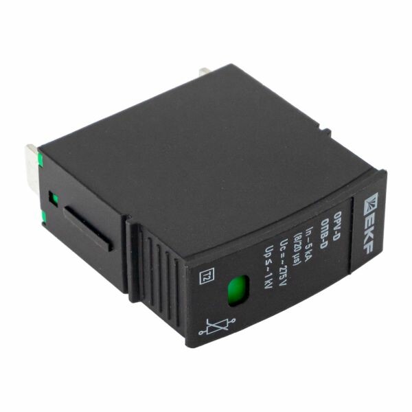Сменный модуль к ОПВ EKF предназначен для замены вышедшего из строя варисторного модуля ОПВ. Сменный модуль представляет собой варистор, сопротивление которого изменяется в зависимости от приложенного напряжения: в нормальном состоянии ток через варистор предельно мал и сопротивление велико, а при возникновении перенапряжения сопротивление варистора мгновенно уменьшается на несколько порядков, соответственно, возрастает сила тока и происходит сброс импульсного перенапряжения.