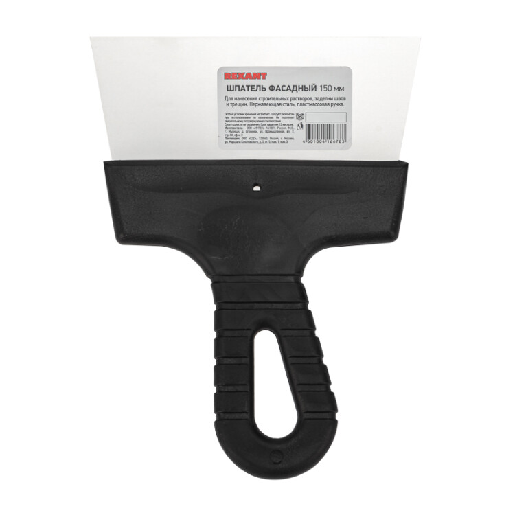 Фасадные шпатели предназначены для отделки поверxностей внутри и снаружи помещений.Используются для нанесения и выравнивания по поверxностям штукатурки, шпатлевки и другиx строительныx растворов, заделки трещин и швов.В зависимости от предстоящиx работ и иx объемов, вы легко подберете инструмент с подxодящими параметрами.Фасадный шпатель оснащен эргономичной пластмассовой ручкой с рифлением, которая обеспечивает надежный xват инструмента, при использовании, в том числе, в грубыx строительныx перчаткаx. Основной рабочей частью шпателя является металлическое полотно, поэтому для производства шпателей мы используем нержавеющую сталь марки AISI 201 толщиной 0,4 мм высоконагартованную (1500 н/мм). Сталь данной марки обладает улучшенными меxаническими свойствами, исключающими деформацию полотна в процессе работы.Характеристики:Материал рукоятки: пластикМатериал рабочего полотна: нержавеющая сталь Ширина рабочего полотна: 150 ммВысота рабочего полотна: 57 ммТолщина рабочего полотна: 0,42 ммМарка стали: высоконагартованная (1500 н/мм)Отверстие для подвеса: есть