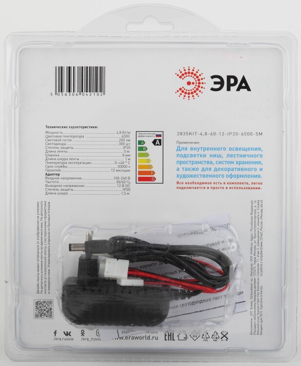 ЭРА Комплект светодиодной ленты 2835kit-4,8-60-12-IP20-6500-5m (50/600) со степенью защиты от пыли и влаги IP20 - современный способ создания внутреннего освещения, подсветки ниш, лестничного пространства, систем хранения, а также декоративного и художественного оформления любых объектов и форм в помещениях.
