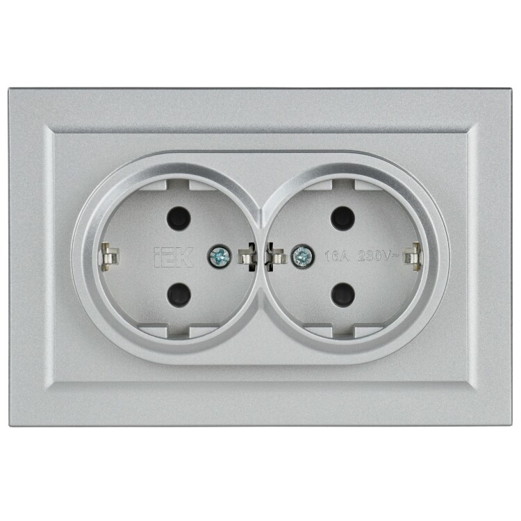 Розетка двухместная IEK РСш12-3-БрА Brite (16 А, IP20) скрытой установки, с заземлением и защитными шторками, в сборе, алюминий