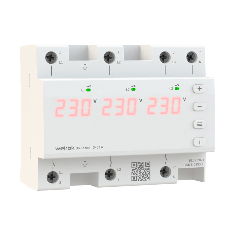 Реле напряжения 3ф 63А 6мод D6 Welrok RED