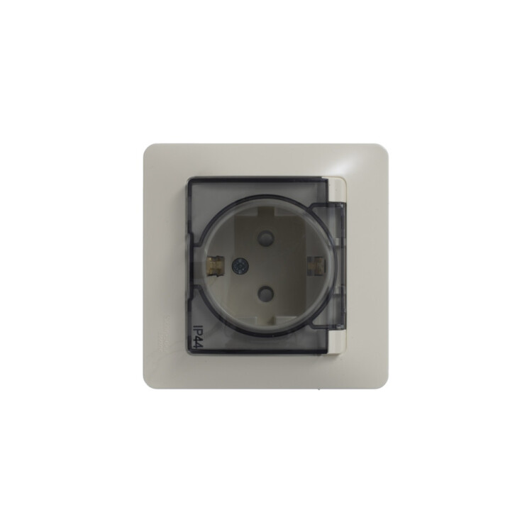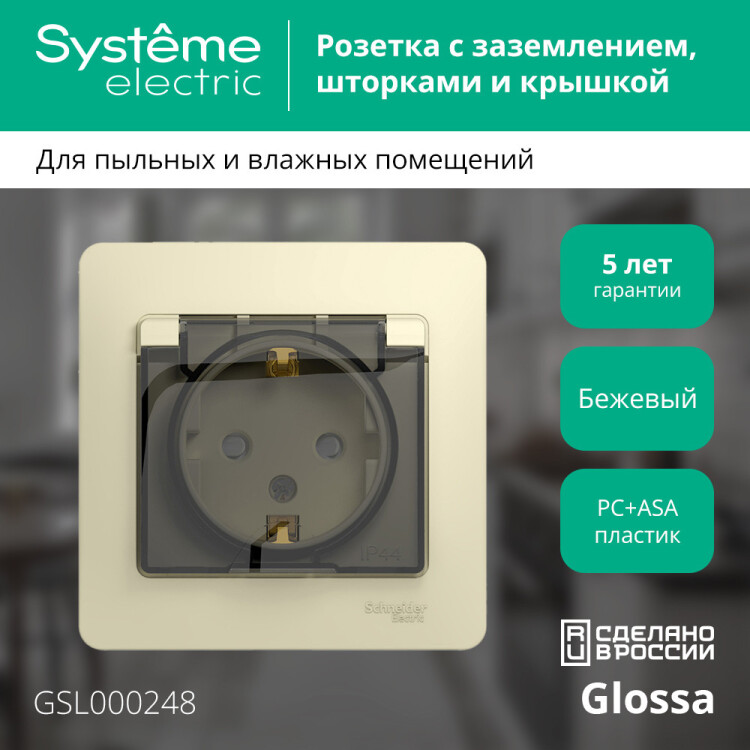 Розетка одноместная Schneider Electric GSL000248 Glossa (16 А, IP44, в сборе) с заземлением и защитными шторками, с крышкой, бежевый