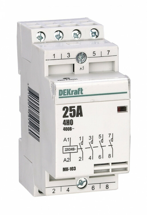 Модульный контактор серии МК-103 Dekraft; ном.ток 16 А (АС-7а); кол-во и исполнение контактов – 4НО; напряжение управления 220 В пер.тока; ширина – 2 мод. х 18 мм; установка – на DIN-рейку. Контакторы МК-103 применяются в сетях напряжением до 400 В пер.тока для дистанционного управления небольшими нагрузками, требующими большого количества включений / отключений, например, насосы, системы вентиляци и и т.п. Модульные контакторы не требуют дополнительных настроек и специального обслуживания.