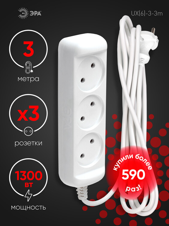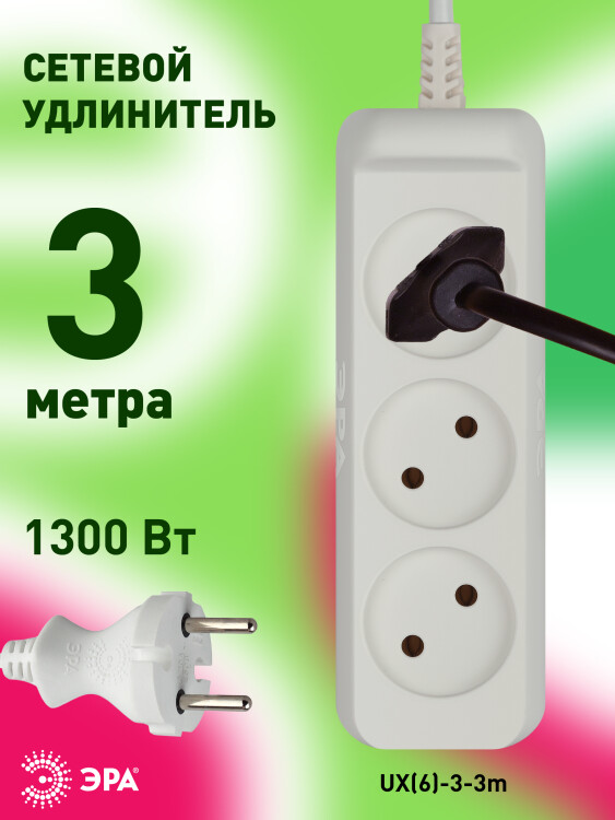 Удобный бытовой удлинитель ЭРА UX(6)-3-3m на 3 розетки, без заземления. Рассчитан на одновременное подключение к розетке до трёх маломощных электроприборов. Максимальная нагрузка - 6 A/ 1300 Вт. Шнур оптимальной длины - 3 метра. Надёжный двухжильный провод ПВС. Корпус изготовлен из прочного негорючего полипропилена, в составе - защищающие от возгорания антипирены. Закруглённые углы, брендирование на вилке и корпусе, базовый белый цвет- этот удлинитель отличается аккуратным приятным дизайном.