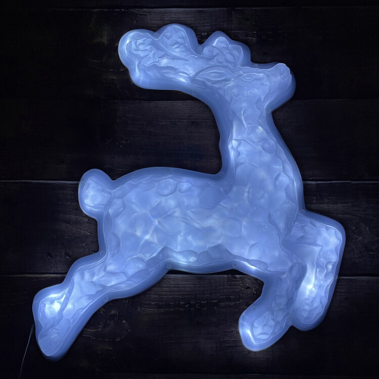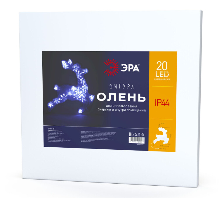 Новогодняя светодиодная настенная фигура ЭРА "Олень" (арт. Б0041935) для праздничного декора внутри и снаружи помещений. Защищена от влаги и пыли (IP44), отличается морозостойкостью. Работает от стандартной электросети 220 В, прозрачный провод практически не заметен. LED-фигура представляет собой бегущего северного оленя, узор на теле которого напоминает снежинки. Светится холодным белым светом. Дизайн фигуры идеально подходит к зимним праздникам. Фигура легкая, можно крепить на двусторонний скотч (в комплект не входит). Размеры фигуры: 55 х 4,2 х 50 см. Свет создают 20 ярких и экономичных светодиодов, которые не перегреваются даже при длительной работе без перерывов. Новогодняя LED-фигура - простой и быстрый способ создать праздничное настроение, украсить дом, офис, общественное пространство.