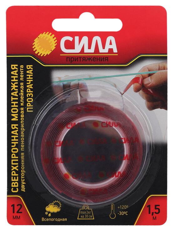 Сверхпрочная двухсторонняя монтажная клейкая лента "Сила" SDST-1215TR применяется при установке светодиодных лент, гирлянд, для монтажа прозрачных элементов, мебельного декора, табличек, эмблем, витражей.